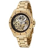 This dauntless Invicta makes a bold statement with its intricate detail and design, personifying a gallant structure.Featuring an eye-catching gold-tone skeleton dial with black inner bezel and exhibition caseback, the Invicta Women's Pro Diver Collection Mechanical Skeleton Gold-Plated Stainless Steel Watch is truly stunning. Perfect for adding interest to work wear, this one-of-a-kind timepiece has a brushed and textured 18k gold-plated stainless steel case and bracelet, luminous hands for easy reading, and a sweeping second hand. Reliable and precise, this watch also boasts the precision and traditional appeal of mechanical hand-wind movement and is water resistant to 165 feet (50 meters). It arrives in a bright yellow box that's perfect for storage or gift-giving.