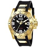 Gold-plated stainless steel case with a black rubber strap. Fixed gold-tone bezel. Black dial with luminous gold-plated hands and index hour markers. Arabic numerals mark the 3, 6, 9 and 12 o'clock positions. Minute markers around the outer rim. Luminiscent hands and markers. Date display appears at the 3 o'clock position. Quartz movement. Scratch resistant flame fusion crystal. Screw down crown. Solid case back. Case diameter: 50 mm. Case thickness: 18 mm. Tang clasp. Water resistant at 200 meters / 660 feet. Invicta Reserve Excursion gold-plated Mens Watch 6255.Gorgeous color contrast and sporty style combine in the Men's Gold-Plated and Black Rubber Watch from Invicta. A brushed 18-karat gold-plated stainless steel case surrounds a black dial that pops with oversized Arabic numerals in white. Luminous hands sweep around the dial, which also has a calendar window at the three o'clock position and a gold-tone second hand. A comfortable black rubber band with a gold-tone buckle fastens the watch securely to your wrist. Featuring precise Swiss quartz movement, the versatile timepiece is water resistant to 656 feet (200 meters).
